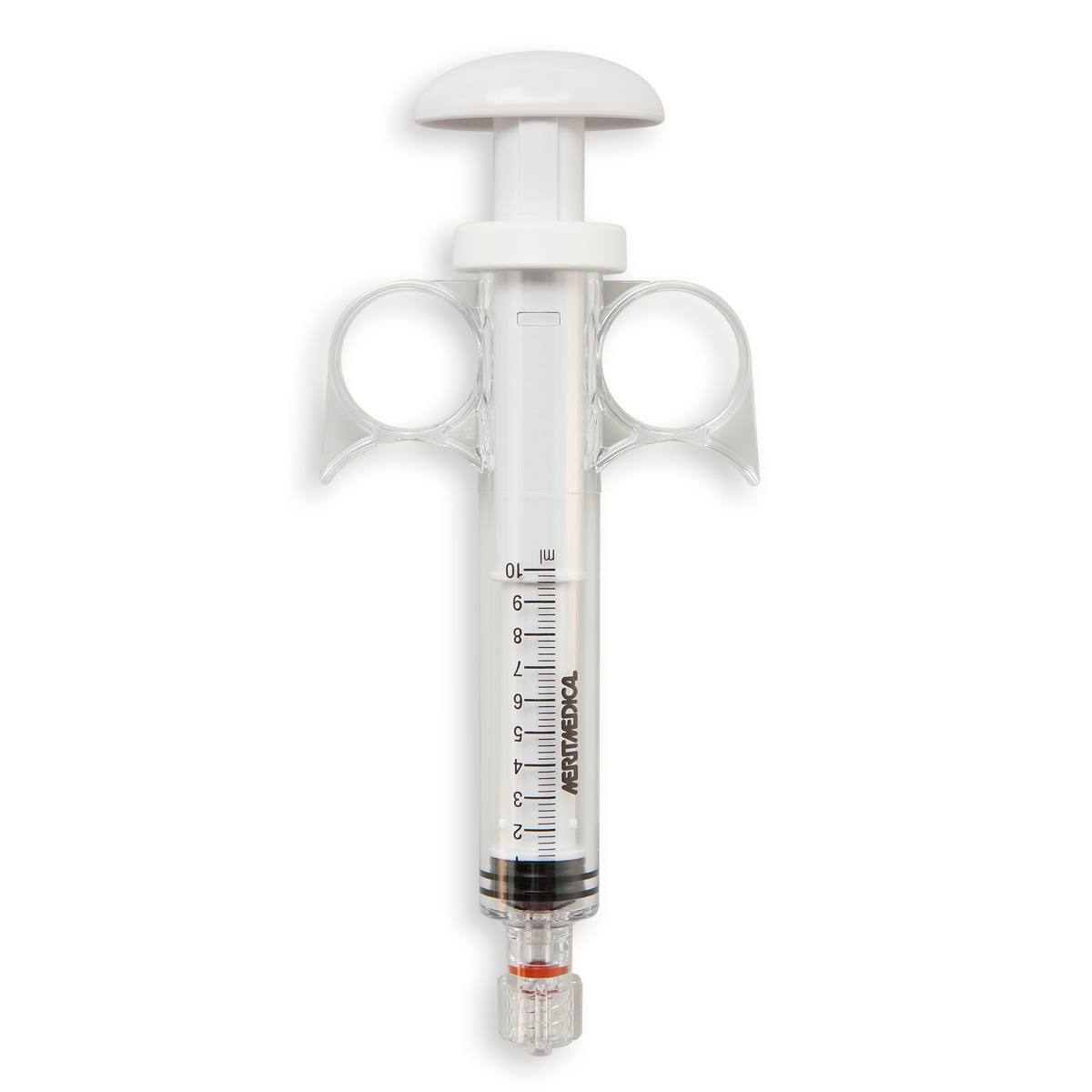 White, Merit, Polycarbonate (Clear), ABS, Silicone, Rotating Male Adapter, Palm Pad Plunger and Ring Grip, Solid Plunger, 10 mL, Coronary Control Syringe